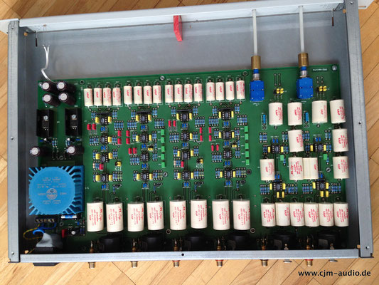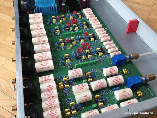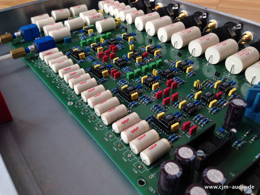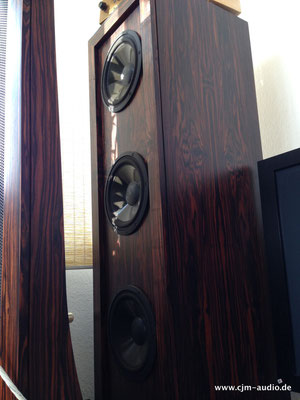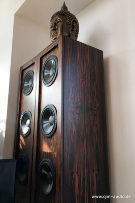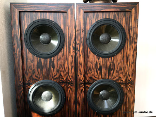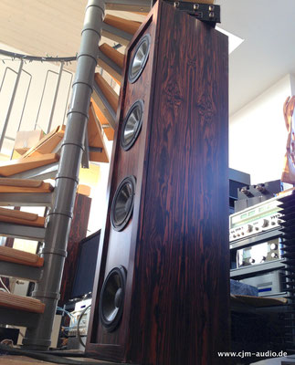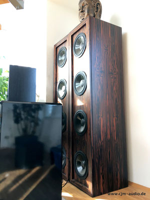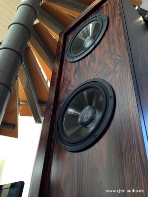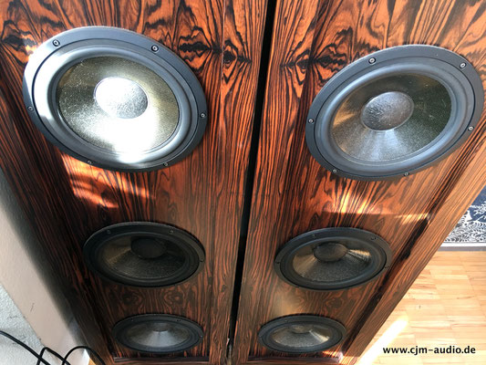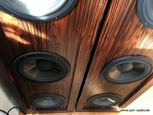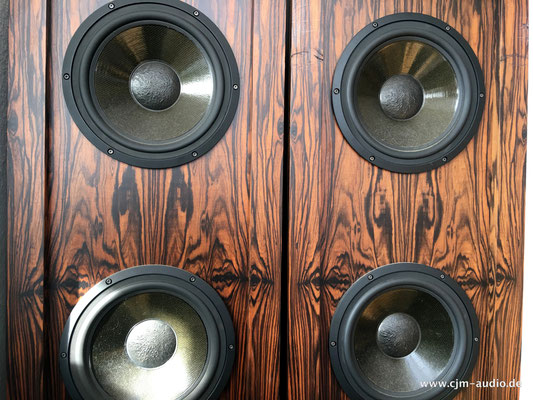 2x Subwoofer mit 4 Tieftönern (Eton) und elektrostatischer Flächen-Mittel/Hochtonlautsprecher; hoher Wirkungsgrad - Elektrostat mit hauchdünner spezialbeschichteter Membran; externe Frequenzweiche (bestückt mit ausschließlich Mundorf Bauteilen)